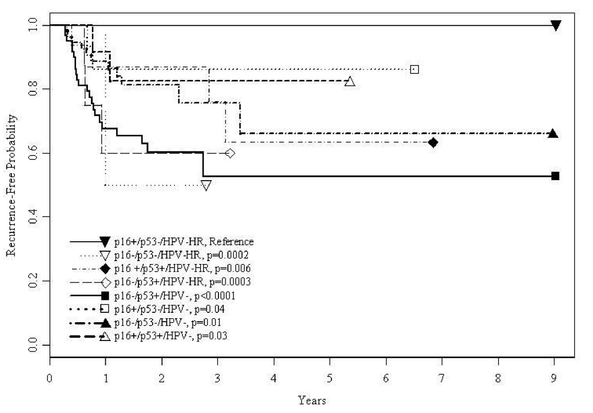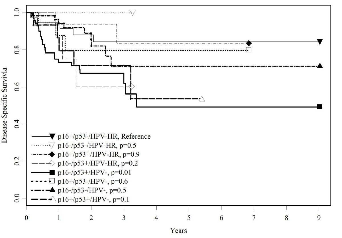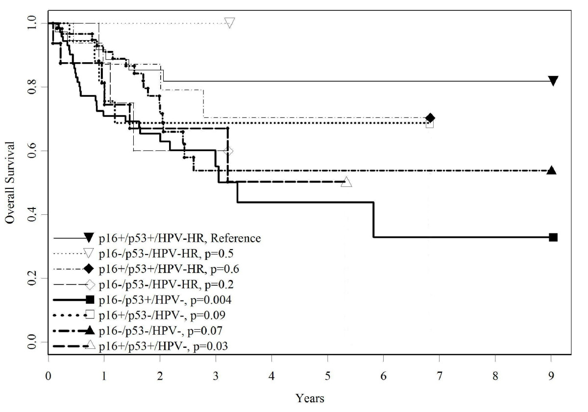 Survival curves based on the Kaplan-Meier method. Significance was based on Log-rank comparisons of each group to the reference group, p16+/p53-/HPV-HR.