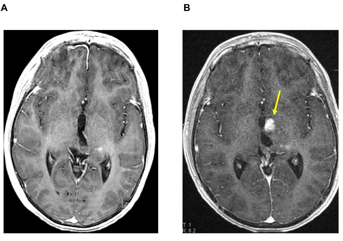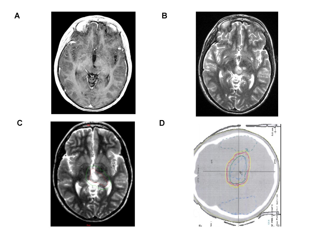 A healthy ten year-old boy with tinnitus and bilateral papillary oedema underwent a brain MRI showing a small tumour of the tectal plate. The lesion presented a signal of low intensity on T1-weighted and a high signal on T2-weighted sequences. No contrast enhancement was visible. The process was responsible for triventricular hydrocephalus by aqueduct compression. The first treatment was a ventriculocysternostomy followed, fifteen months later, by a partial resection when the lesion increased in size. Histopathological diagnosis was a grade II oligodendroglioma (WHO classification), with a proliferation index (MIB 1) of 5%. Three years after the first surgery, a systematic follow-up MRI revealed a recurrence localized on the quadrigeminal plate, close to the left thalami and the third ventricle, again without gadolinium enhancement. A second surgery was attempted, showing the same histology, but a tumour residue was left on the left thalamus (Figure 1). Treatment was completed six weeks later by RT using proton beams, delivering 54 Gy in 30 fractions of 1.8 Gy. Radiation fields encompassed the medial parts of the thalami (Figure 1C, D). Radiological and clinical data were then evaluated every 3 months thereafter. Six months after RT, systematic MRI found obvious development of a new lesion with an important contrast enhancement and mass effect on the third ventricle (Figure 2), however the patient remained asymptomatic.