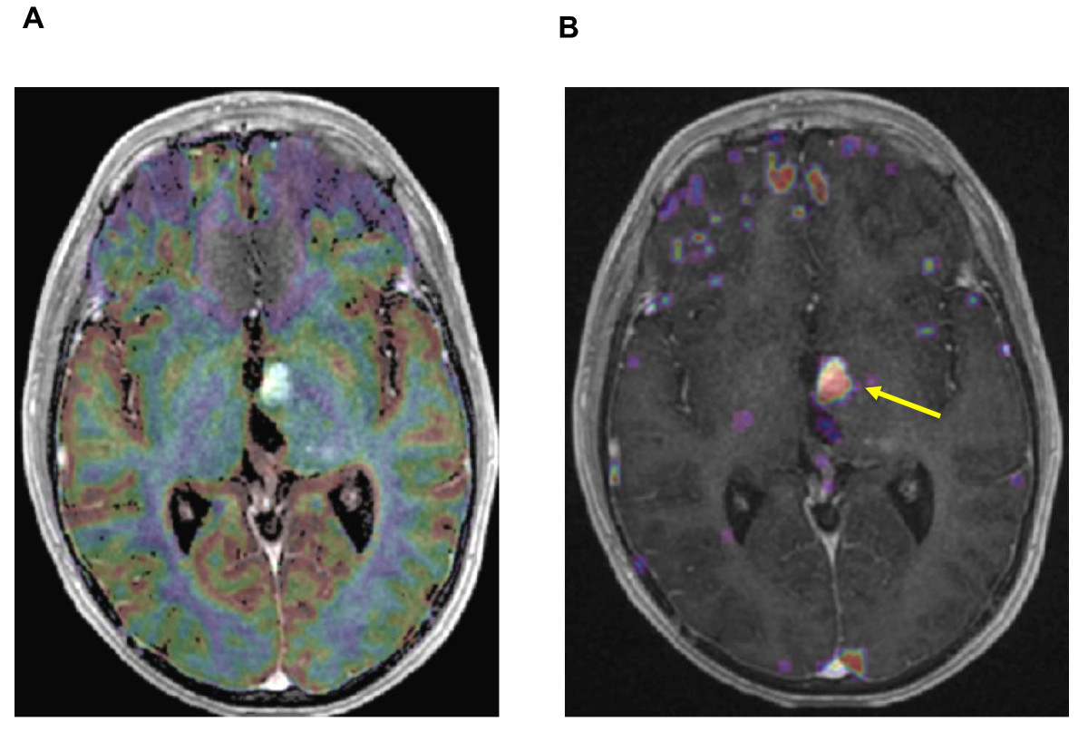 This DSC-MR technique evaluates tissue changes, close to the physiopathology of PsP, whereas metabolic tools as FDG-PET or MR spectroscopy (MRS) analyse level of glucose uptake or distribution of metabolites peaks. MRS can distinguish recurrent true necrosis from active tumour but it needs long acquisition time. In 18FDG-PET, FDG uptake is not specific of tumour tissue and false positive can be observed in non malignant inflammatory processes. The use of aminoacid tracers as 11C-methionine better discriminates post-RT necrosis from tumour recurrence but it is rarely available in daily practice. Recently, the DSC-MR technique was proposed for adult high-grade gliomas in this situation as an alternative tool. It can be incorporated in the routine follow-up, within the interval of three to six months post-RT where PsP can be observed. Importantly, there is a risk of including children with gliomas in phase II studies for "recurrent disease" that would be spontaneously reversible, leading to false positive results, consequently delivering salvage treatments for "pseudo-progressive" patients who could be, at the contrary, potentially long term survivors.