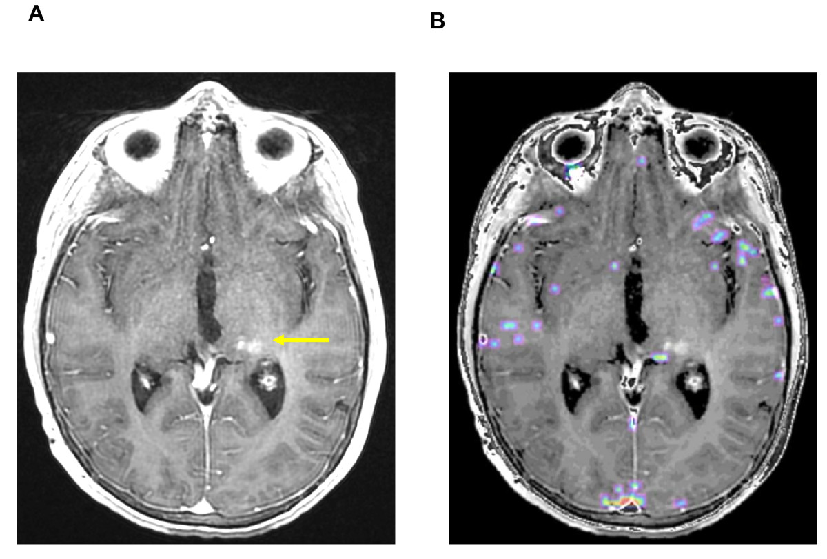 Subacute radiation-induced modifications have been described previously in childhood gliomas, with or without concomitant or sequential use of chemotherapy. In adults, these changes are more and more reported after combined radio-chemotherapy. MRI findings usually consist on new contrast enhancing mass on T1-weighted imaging with gadolinium, which is indistinguishable from tumour progression. It occurs usually within the irradiated tumour volume but radiation-induced lesions could be located less commonly in the controlateral hemisphere, remotely from the primary tumour site. To our knowledge, it is the first case of pseudo-progression fully described after exclusive proton RT. Here, time of occurrence was delayed (6 months) since the typical time frame is rather within 3 months after chemo-radiation, possibly due to the absence of concomitant chemotherapy. Cerebral injury has been classified according to time to appearance after RT as "acute", with brain oedema occurring during RT, mostly transient and reversible; subacute or "early delayed" injury, occurring a few weeks to three months post-RT, improving within six weeks; late injury, occurring months to years post-RT, including true radionecrosis. It is often irreversible, progressive, and possibly lethal and constitutes the major dose-limiting clinical complication of brain irradiation, particularly in children. Pseudo-progression (PsP) could be considered as a pathological continuum between acute post-RT reaction and treatment-related necrosis. Mechanisms behind these events are not fully understood but are probably related to micro-vessels changes. Post-RT brain injury induces a focal tissue reaction with inflammatory component and increased capillary permeability, causing fluid transudation into the interstitial space and brain oedema. Transient alterations in the blood-brain barrier may be responsible for new or increased contrast enhancement, falsely suggesting tumour progression, with low perfusion values.