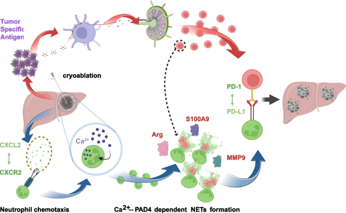 These findings underscore the critical role of neutrophils and their NETs in immune escape following cryoablation. Targeting the CXCL2-CXCR2-Ca2+-PAD4 axis could enhance the therapeutic response to PD-1 antibodies, providing a potential strategy to improve treatment outcomes for colorectal cancer with liver metastases.
