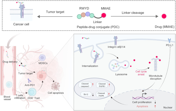 ConclusionThe integrin α6-targeting conjugate RWYD-MMAE demonstrates promising therapeutic efficacy and safety in treating LUAD. The synergistic therapeutic effect of combining RWYD-MMAE with anti-PD-1 immunotherapy provides a new perspective on the potential of combination therapy for LUAD treatment.