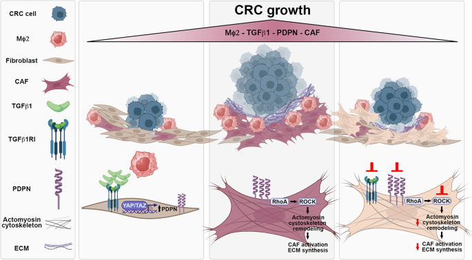 PDPN expression was significantly elevated in the stroma of the colorectal tumor tissues compared to normal tissues and correlated with M2-like macrophage infiltration. High PDPN expression was associated with reduced relapse-free survival in CRC patients. Stromal cells pre-conditioned with M2-like macrophages upregulated PDPN and more effectively supported the growth of three colon adenocarcinoma cell lines. PDPN depletion impaired the ability of stromal cells to promote tumor cell proliferation. Mechanistically, M2-like macrophage pre-conditioning induced a TGF-β1–dependent increase in YAP/TAZ nuclear localization, RhoA/ROCK/myosin-driven cytoskeletal contractility, and extracellular matrix (ECM) production in stromal cells. Inhibition of TGF-β1 signaling or ROCK activity reduced stromal support for cancer cell growth.