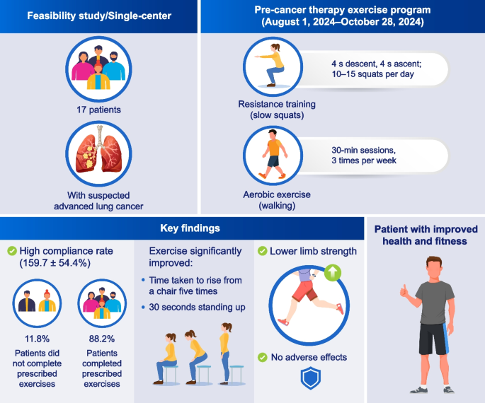 ConclusionsA structured exercise program initiated from the first visit to treatment initiation was feasible and safe in patients with advanced lung cancer. Notably, improvements in the five-time sit-to-stand test and 30-second chair stand test were observed, suggesting potential benefits for enhancing lower-limb functional performance during this period. Further studies, including randomized controlled trials, are warranted to assess its impact on clinical outcomes and long-term patient wellbeing.