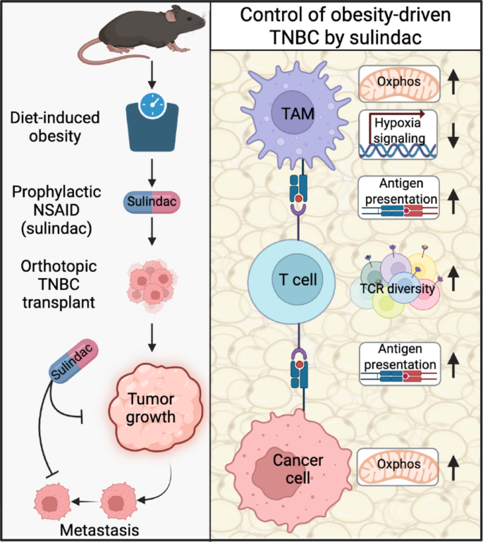 Obesity affects over 40% of women in the US and increases the risk and progression of several cancers, including triple-negative breast cancer (TNBC), in part through chronic low-grade inflammation and impaired antitumor immunity. While weight loss can reverse obesity-driven cancer risk, cost and other factors limit the accessibility of effective weight loss interventions. This study investigated whether sulindac, a nonsteroidal anti-inflammatory drug (NSAID), could mitigate obesity-driven TNBC progression. Using multiple preclinical models, we demonstrate that sulindac treatment abrogates obesity-accelerated tumor growth and metastasis without affecting body weight or composition. Bulk transcriptomic profiling revealed obesity-driven suppression of immune-related gene signatures in the tumor microenvironment (TME)—including antigen presentation—while sulindac treatment restored these signatures. Single-cell RNA sequencing identified sulindac-mediated reprogramming of tumoral metabolism toward oxidative phosphorylation and restoration of antigen presentation machinery in tumor-associated macrophages. Sulindac also reversed obesity-driven reduction in T cell receptor diversity within the TME. We conclude that sulindac treatment remodels the TME and restores obesity-associated impairments of immunosurveillance, offering a potentially accessible intervention to limit obesity-driven TNBC progression. We demonstrate that NSAIDs, which are generally safe, cheap, and readily available, limit the burden of obesity-driven TNBC preclinically, warranting further evaluation as a targeted clinical intervention.