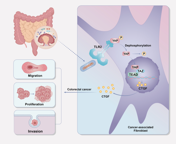 Fusobacterium nucleatum (F. nucleatum) is increasingly recognized as a microbial driver of colorectal cancer (CRC) progression through immune modulation, inflammation dysregulation, and activation of oncogenic signaling cascades. Cancer-associated fibroblasts (CAFs), the predominant stromal constituents within the tumor microenvironment (TME), play pivotal roles in orchestrating tumorigenic processes. While F. nucleatum’s interactions with epithelial and immune compartments have been extensively characterized, its immunological crosstalk with CAFs remains elusive. Through multimodal experimental approaches including RNA sequencing and functional validation in xenograft models, we delineate a novel TLR2/YAP/CTGF signaling axis mediating F. nucleatum-driven CAFs activation. Specifically, F. nucleatum colonization induces TLR2-dependent YAP dephosphorylation, facilitating its nuclear translocation and transactivation of CTGF, a classic regulator of stromal-tumor crosstalk. Clinically, elevated CTGF expression correlates with F. nucleatum burden in human CRC specimens. These findings position CTGF as a potential therapeutic target in microbiota-driven colorectal carcinogenesis.