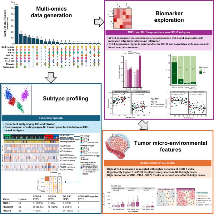 Multi-omics analysis confirmed high heterogeneity across/within neuroendocrine and non-neuroendocrine subtypes. Methylomics analysis identified four methylome clusters that may enhance subtype prediction, prognosis, and longitudinal monitoring of subtype evolution. Immunohistochemistry analysis showed high MHC-I expression in non-neuroendocrine subtypes, which have greatest potential benefit from adding immunotherapy to chemotherapy; high DLL3 expression associated with neuroendocrine subtypes and an immune-cold tumor microenvironment. Multiplex immunofluorescence demonstrated associations of MHC-I with spatial arrangement and phenotypic features of immune cells in the tumor microenvironment of high-MHC-I-expressing SCLC, providing mechanistic rationale for MHC-I as a potential biomarker of immunotherapy response.