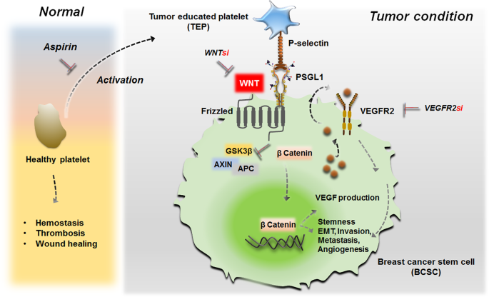 TEPs have elevated expression of P-selectin and interacts with BCSCs via P-selectin and PSGL1 on BCSCs surface. Treatment with aspirin had restorative impact on P-selectin level, converting TEPs from active to resting platelet (RP) state. Under TEPs influence, BCSCs were tumorigenic, clonogenic, multidrug resistant, invasive with numerous invadopodia and remained skewed towards mesenchymal phenotype. Administration of RP reduced TEP associated BCSC virulence both in-vivo and in-vitro. P-selectin-PSGL1 interaction results in binding of WNT to FRIZZLED followed by stabilization and nuclear translocation of β-catenin. Nuclear β-catenin promotes stemness-EMT (Epithelial to mesenchymal transition)-metastasis, along with stimulation of autocrine VEGF-VEGFR2 cascade. Inhibition of WNT and VEGFR2 by RNAi confirmed the critical role of this axis in regulating TEP’s influence on BCSCs.