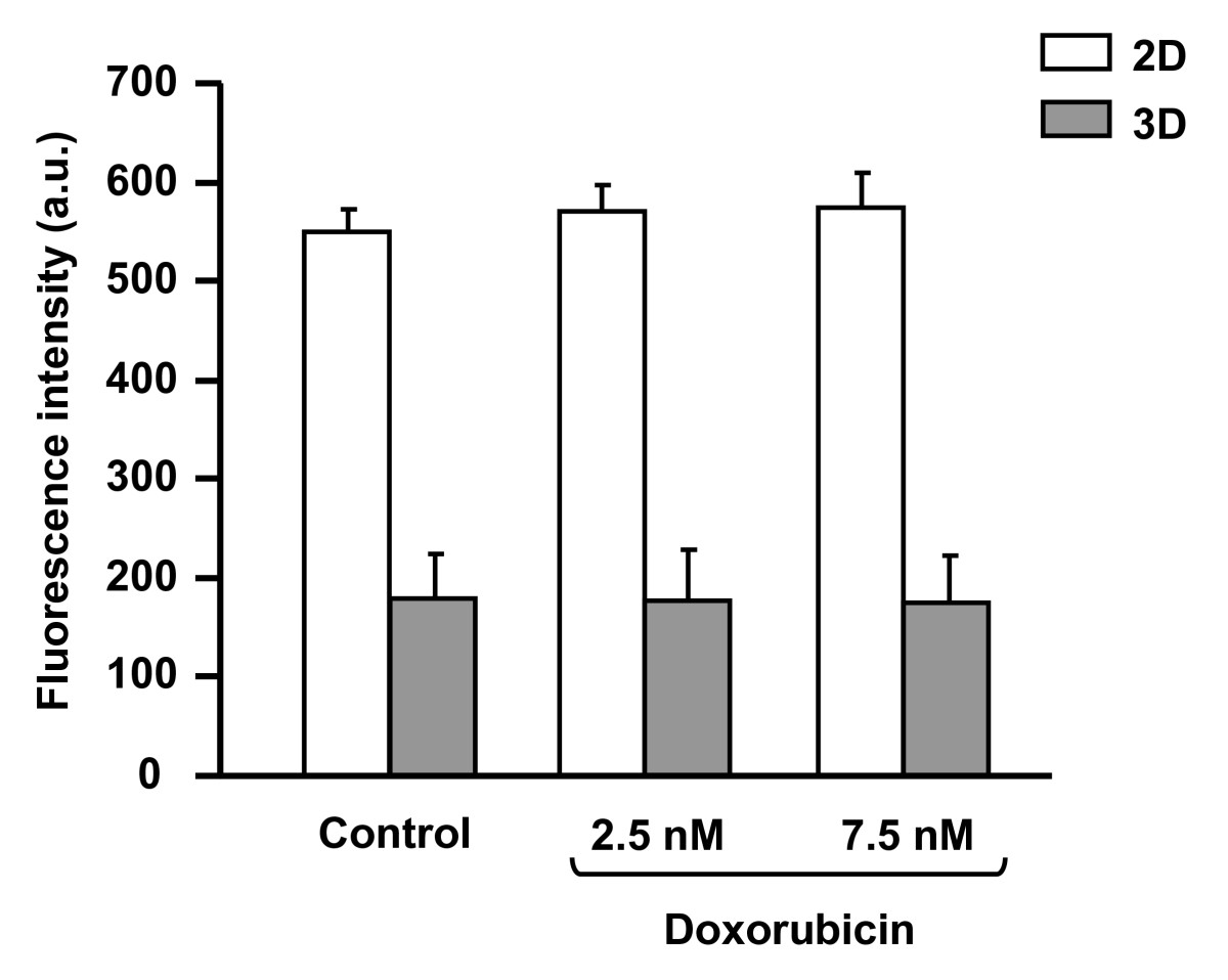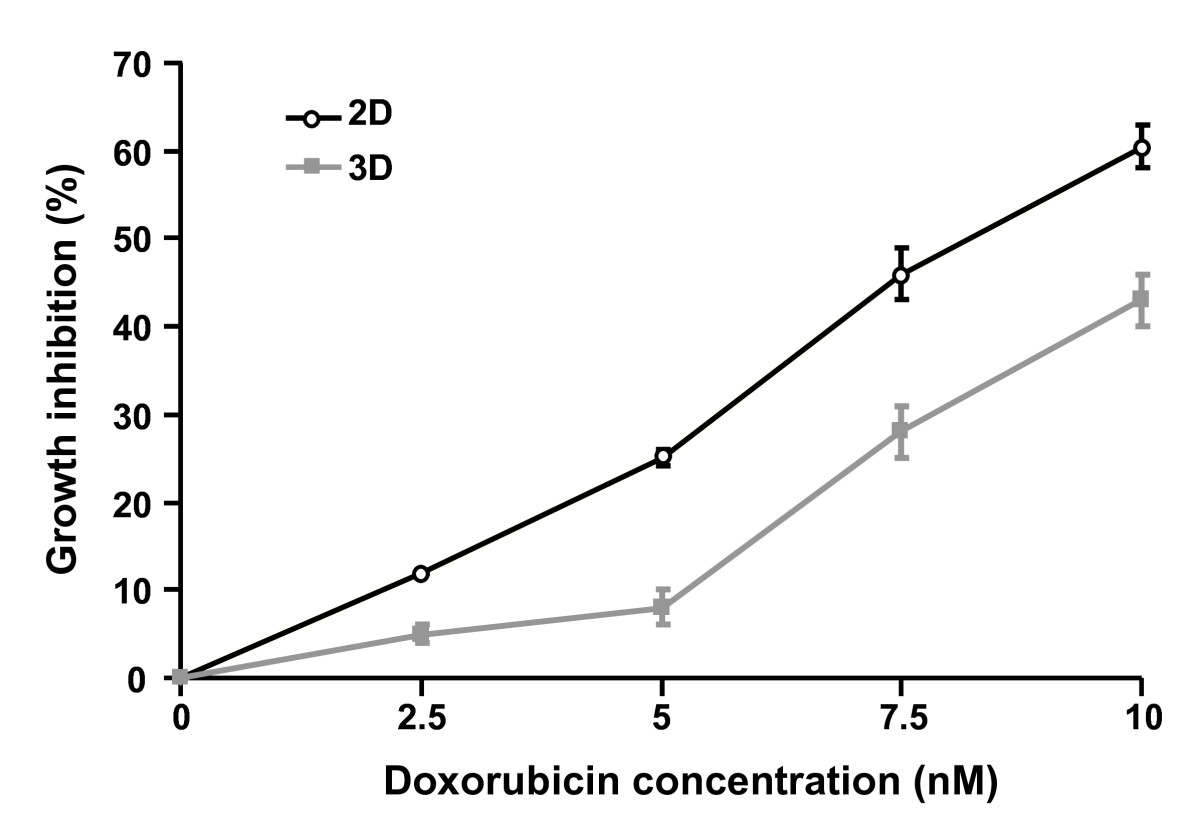 After 48 h of culture in 3D matrix or on 2D plastic, cells were treated with doxorubicin at 0, 2.5, 5, 7.5 or 10 nM for 24 h. Then, cells were counted to evaluate cell number. Values represent the mean ± S.E.M. of three independent experiments.