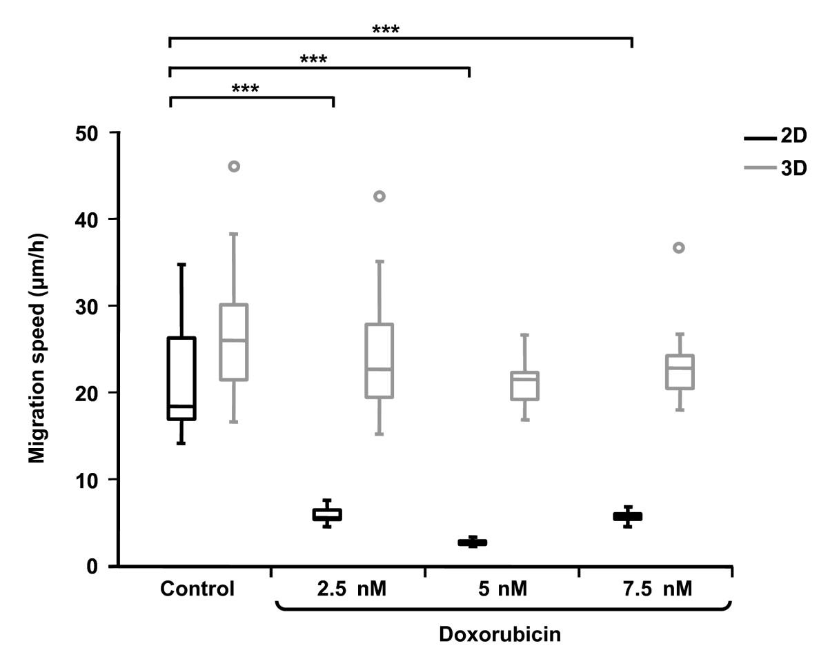 Cells cultured during 48 h within 3D matrix or on 2D plastic were incubated with doxorubicin at 0, 2.5, 5 and 7.5 nM for 24 h and were tracked by time-lapse videomicroscopy during the last 12 h of drug incubation. The migration speed was displayed as a box plots (bottom of box, 25th percentile; and top of box, 75th percentile) and middle line indicates the median (15 cells per sample). *** p < 0.001 significant difference between control and doxorubicin treatment.