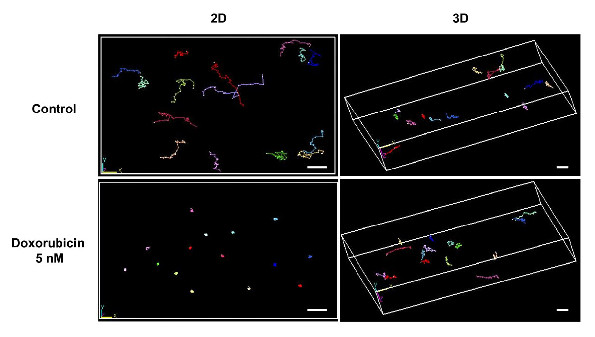 Cells cultured during 48 h within 3D matrix or on 2D plastic were incubated with doxorubicin 0 and 5 nM for 24 h and were tracked by videomicroscopy during the last 12 h of drug incubation. Each colour on the figure corresponds to different cells (15 cells per sample). (Bar = 100 μm).