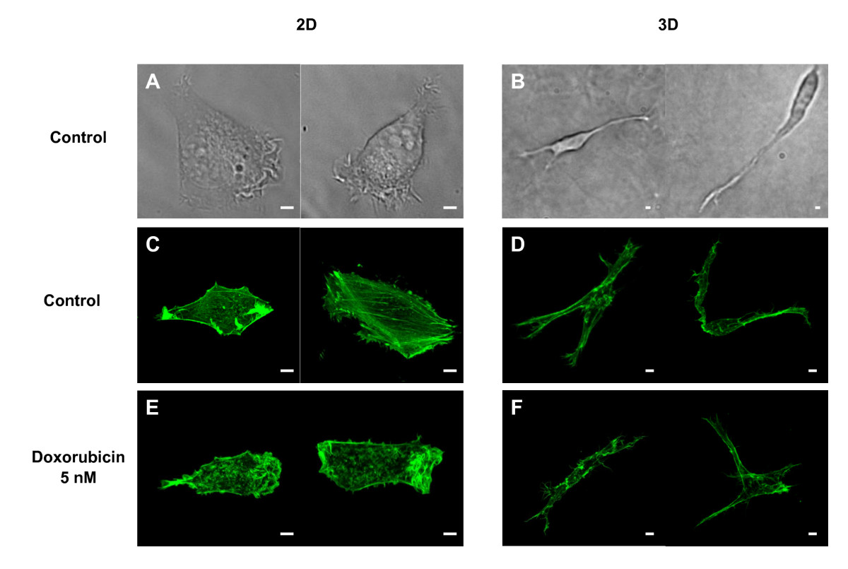 Cells cultured during 48 h within 3D type I collagen matrix or on 2D substrata were incubated with doxorubicin 0 and 5 nM for 24 h. Typical morphology of cells seeded on 2D substrata (A) or cultured within 3D matrix (B) were obtained by phase contrast microscopy. F-actin was stained by immunofluorescence with Alexa Fluor 488 phalloidin and captured using confocal microscopy in control cells in 2D (C) or 3D (D), and in treated cells in 2D (E) or 3D (F). (Bar = 5 μm).