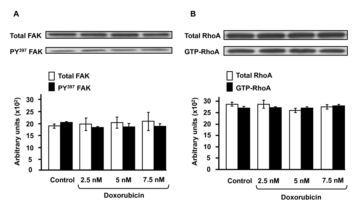 Cells were cultured during 48 h in 3D collagen gel then treated with 2.5, 5 or 7.5 nM of doxorubicin for 24 h. Representative immunoblot of total FAK or Tyr397-FAK (A) and of total RhoA and RhoA-GTP (B). The graphs show the mean values of three independent experiments.