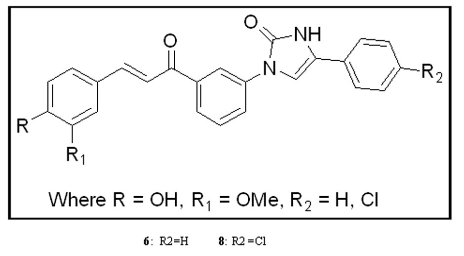 Combretastatin (CA-4) compound contains structurally important feature, such as 2-phenyl rings separated by 2-carbon atom bridges and is a known inhibitor of tubulin polymerization(18)(19)(20). Chalcone compounds are natural compounds isolated from edible plants and are structurally similar to CA-4 compound having 2-phenyl rings separated by 3-carbon atom bridges with inhibitory property against tubulin polymerization(21)(22)(23). Imidazolones are also structurally similar to chalcones (2-phenyl rings are separated by 3-carbon atoms with 5 membered structures). Hence we focussed our attention towards preparing chalcone-imidazolone conjugates in search of potent anti-cancer molecules (Figure 1). Surprisingly, these conjugates have shown effective cytotoxicity in wide range of cancer cell lines(24).