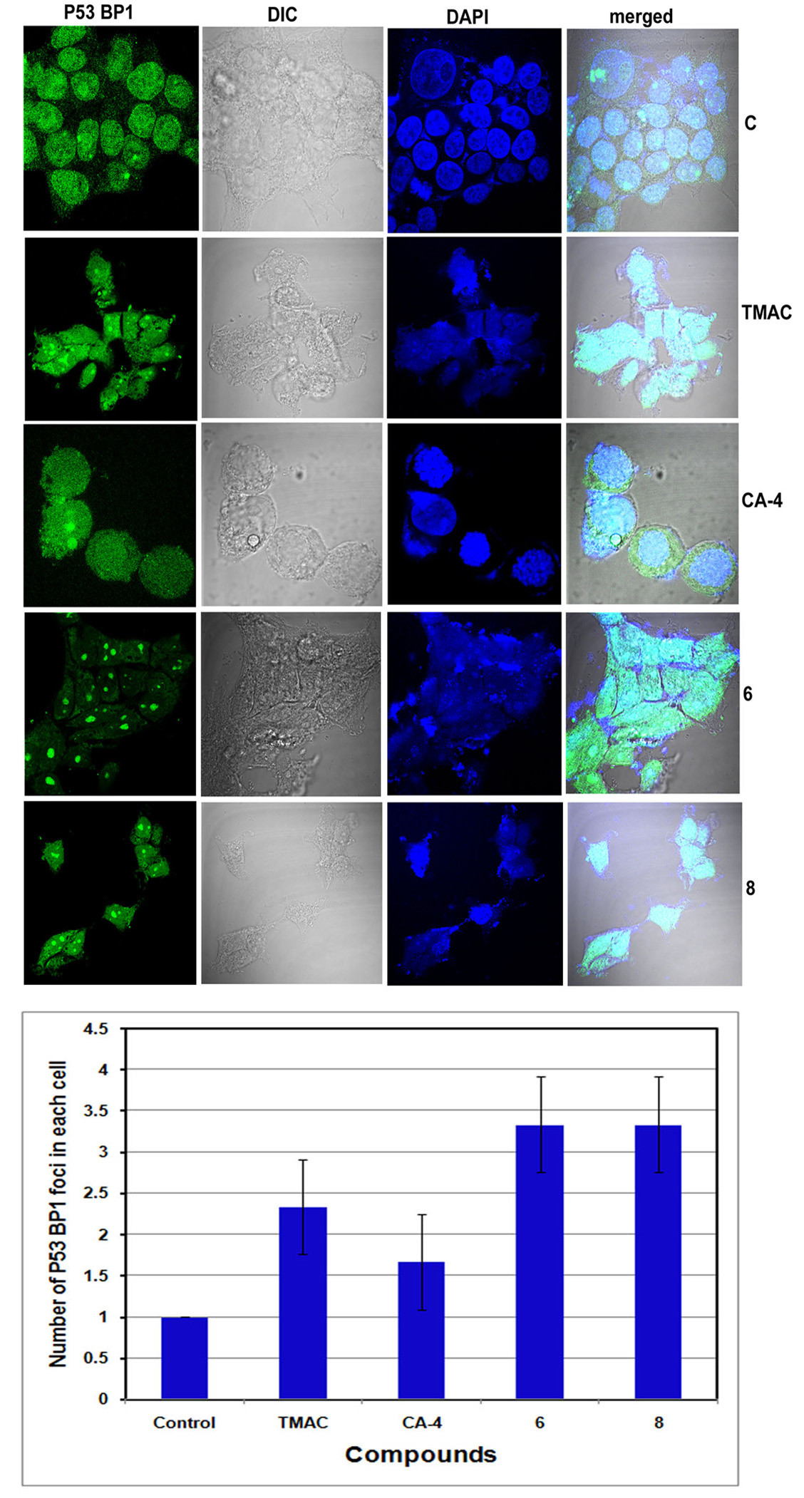 MCF-7 Cells were grown in 10% FBS containing medium on cover slips and treated with 30 μM concentration of chalcone imidazolone compounds (6 and 8). TMAC, is the starting material and CA-4, is the positive control used. Cells were fixed in 4% paraformaldehyde and processed for immunofluorescence with p53BP1 antibody as described in materials and methods. Images were captured using confocal microscopy. The pattern of staining changes was also recorded.