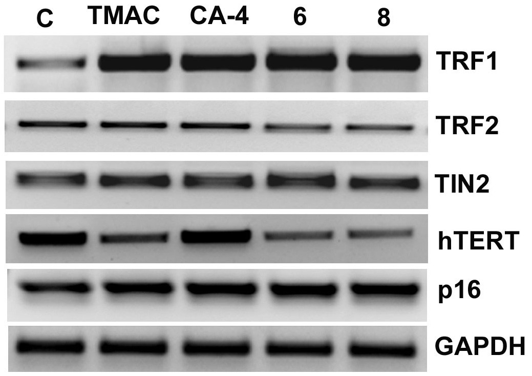 Generally actively proliferating cancerous cells have more telomerase activity. Thus we have investigated the telomerase activity and conducted fluorescence based telomerase assay using cell extracts after compound (TMAC, CA-4, 6 and 8) treatment. Control untreated cells which serve as positive control has highest level of telomerase activity. Telomerase activity of the control cells is lost when the extract was heated at 85°C for 10 min. Fluorescence reading was taken as a measure of telomerase activity. To our surprise down regulation of telomerase activity was observed in compound 6 and 8 treated cells. Hence our data strongly supports the effect of compounds on telomere and regulate the DNA stability (Figure 10).