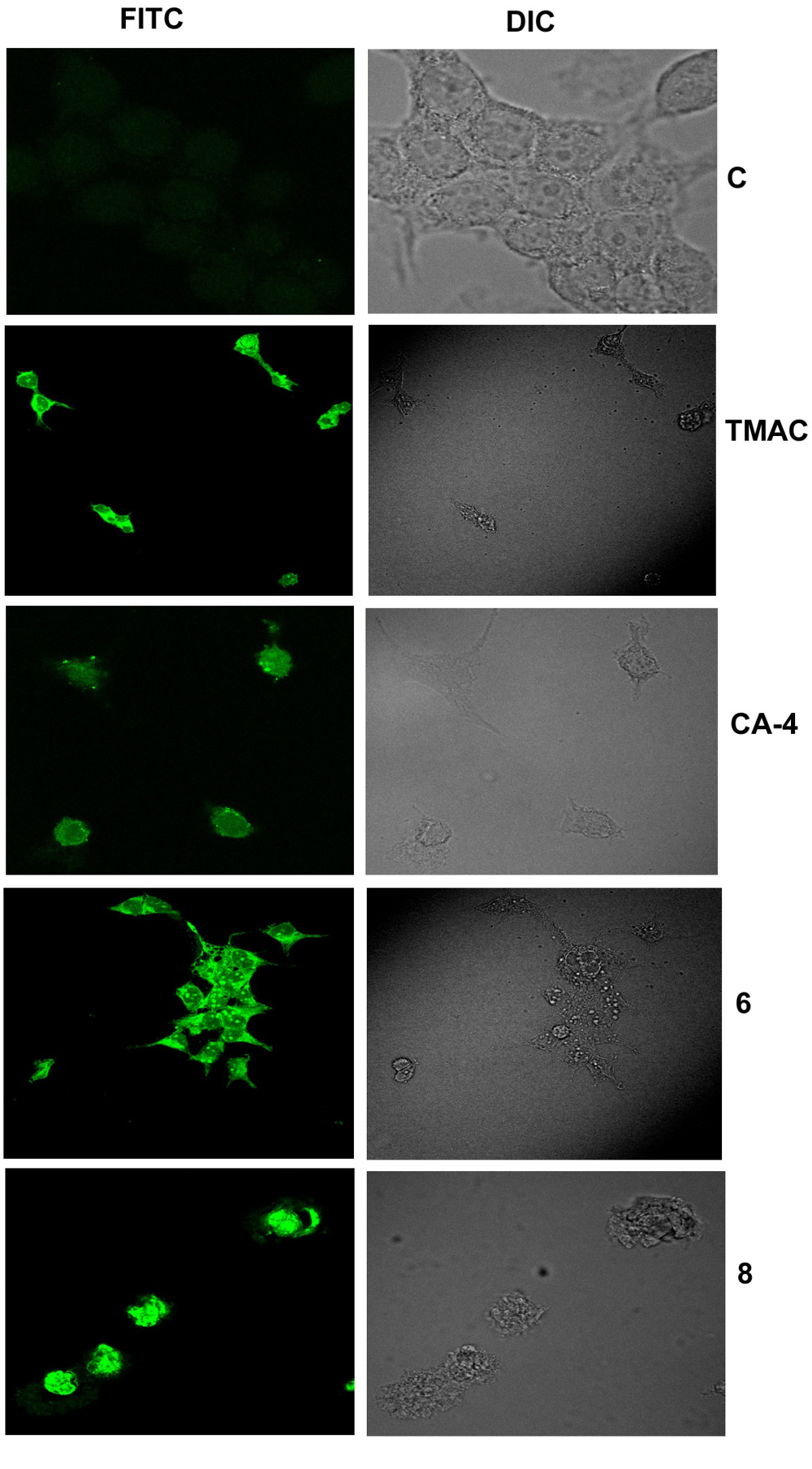MCF-7 cells were treated with compounds TMAC, CA-4, 6 and 8 at a concentration of 30 μM for a period of 24 h. The fragmented DNA was bind to antibody conjugated to FITC. The fluorescence was detected and imaged using confocal microscope. Untreated control cells, were not apoptotic and did not exhibit DNA fragmentation, where as the apoptotic cells in the compound treated condition show green coloured staining. The extent of apoptosis can be visualized by green staining and depicts the extent of DNA fragmentation. Here C denotes control untreated cells.