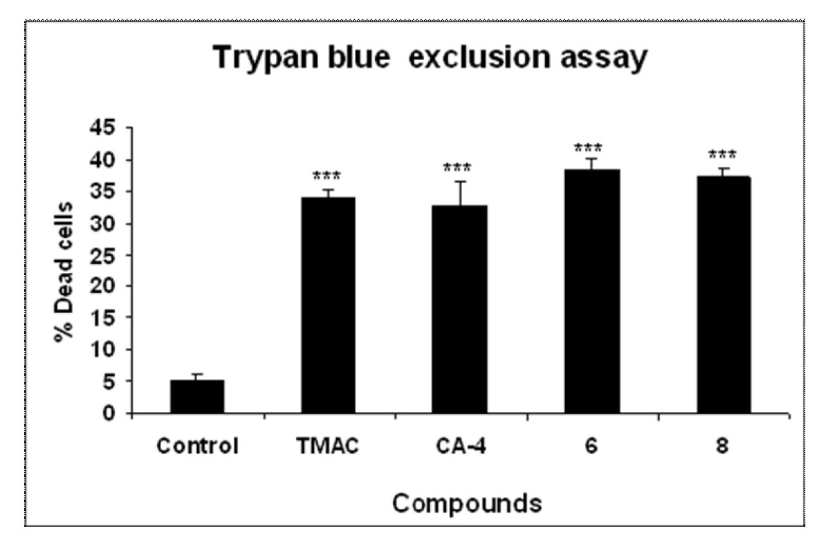 This method is used to determine the number of viable cells present in cell suspension. This method is based on the principle that live cells possess intact cell membranes that excludes trypan blue; whereas dead cells are not capable of excluding trypan blue. Here viable cells show a clear cytoplasm where as non viable cells show blue colour cytoplasm. Compounds were treated for 24 h time period. After compound treatment (TMAC, CA-4, 6 and 8) at 30 μM concentration the cells were trypsinised and the dead and viable cells were counted. Each sample was assayed for triplicates. In this assay 10 μl of 0.4% solution of trypan blue was added to 100 μl of cells. Once after mixing the sample was loaded on to haemocytometer and examined immediately. The percentage of dead cells was calculated.
