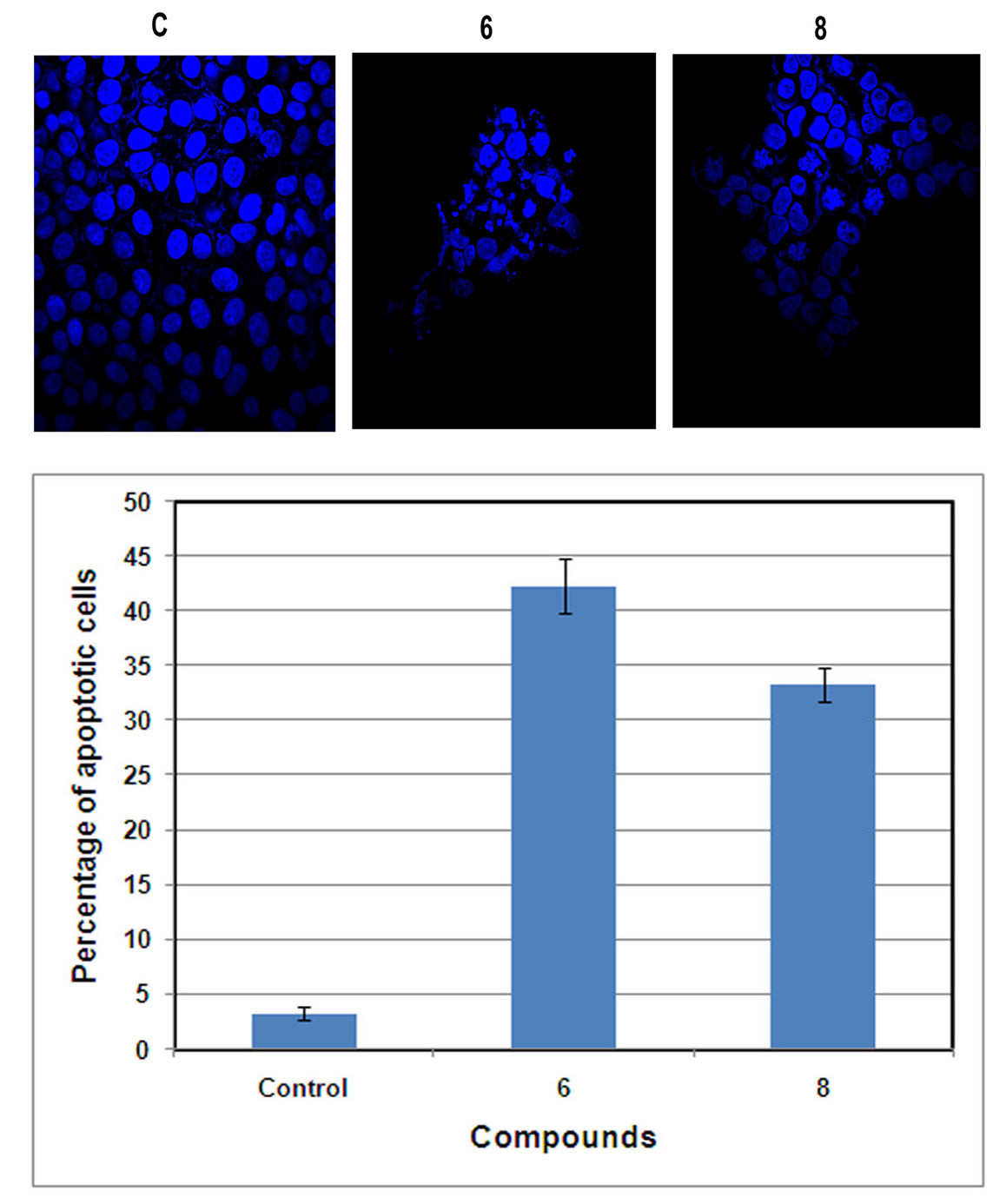MCF-7 cells were grown in DMEM medium with 10% FBS for 12 h. Conjugates (6 and 8) were treated at 30 μM for 24 h time period. The cells were then washed, fixed with 4% paraformaldehyde, and stained with nuclear dye DAPI. The slides were then examined by fluorescence microscopy and photographed. Cells with signs of apoptosis (fragmented nuclei) were observed in chalcone-imidazolone conjugates treated cells, when compared with control, non-treated cells.