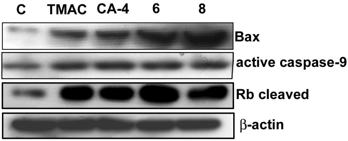 During the process of apoptosis the up-regulation of proapoptotic protein (Bax) occurs as an early event which alone is sufficient to cause apoptosis(25). MCF-7 cells do not contain endogenous caspase-3 and express caspase-9 during apoptosis. Retinoblastoma protein is a known and important substrate molecule that undergoes cleavage by the action of caspases into 48 and 68 kDa proteins(26) and ultimately leads to apoptosis. Hence we were interested to check whether chalcone imidazolone derivatives cause apoptosis by the involvement of Bax, active caspase-9 and cleavage of RB protein. Thus the MCF-7 cells were treated with compounds TMAC, CA-4, 6 and 8 at 30 μM concentration for 24 h and cell lysates were subjected to western blotting using specific antibodies. Our results have shown pronounced up regulation of Bax, active caspase-9 protein as well as cleaved RB in the compound treated cells in comparison to control untreated cells and thus confirming the apoptotic inducing nature of the compounds (Figure 5).