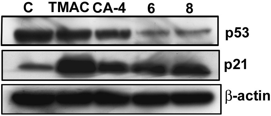 DNA-damaging agents cause cell cycle arrest which ultimately results in apoptosis or senescence and will be regulated by either p53-dependent or independent pathways(27)(28). In order to determine the involvement of p53, p21 and p16 proteins in this event caused by chalcone-imidazolone conjugates, the cells were treated with compounds (TMAC, CA-4, 6 and 8) and Western blot analysis was carried out. The level of p53 protein was found to be down regulated while the levels of p21 and p16 was found to be up-regulated (Figure 6 and 12) particularly in compound 6 and 8 treated MCF-7 cells. The decreased levels of p53 and increased senescence like growth arrest as observed by up-regulation of p21 and p16 proteins clearly shows the lack of involvement of p53 in this event. Our results strongly support the existence of p53 independent pathway in senescence like growth arrest which has been earlier reported(29).