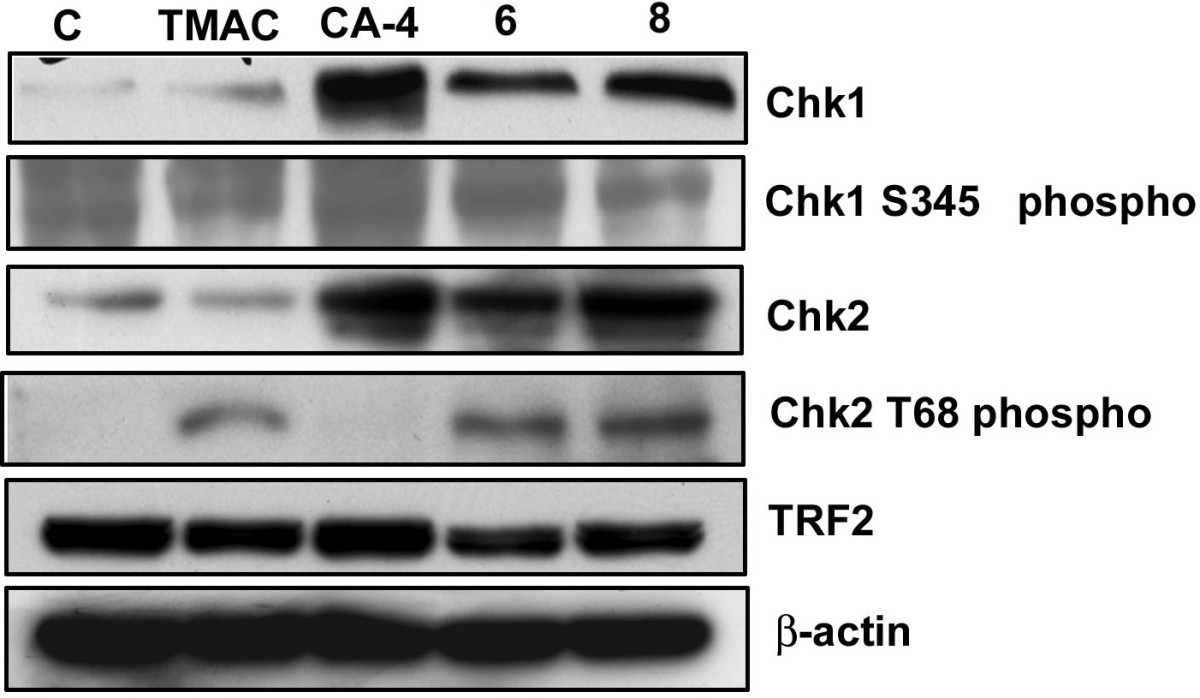 MCF-7 cells treated at 80% confluency with conjugates TMAC, CA-4, 6 and 8 for 24 h. The total cell lysates were harvested and analyzed by immunoblotting with anti-Chk2, anti-Chk1, anti-phospho Chk2T68, anti-phospho Chk1S345 and TRF2. The molecular weights of Chk2, Chk1, Chk2T68, Chk1S345 and TRF2 were 61 KDa, 60 KDa, 61 KDa, 60 KDa and 65 KDa respectively. TMAC is the starting material and CA-4 is positive control. β-actin was used as a loading control. Western blots were representative of three independent experiments. The expression of Chk1, Chk2 and phosphorylated active forms of Chk2T68 and Chk1S345 were found to be up-regulated and levels of telomeric repeat binding factor 2 (TRF2) was found to be down regulated. C represents control untreated cells.