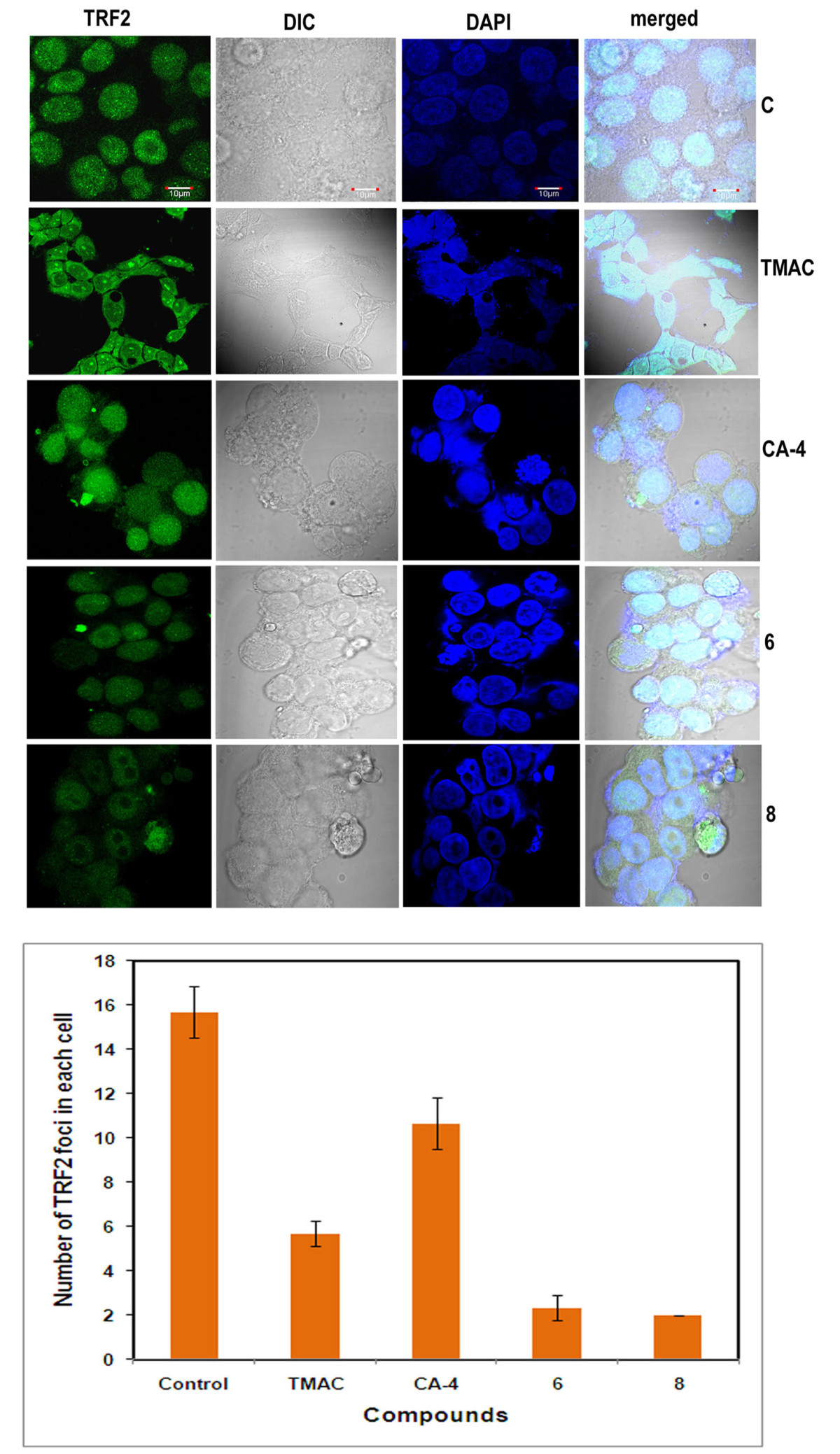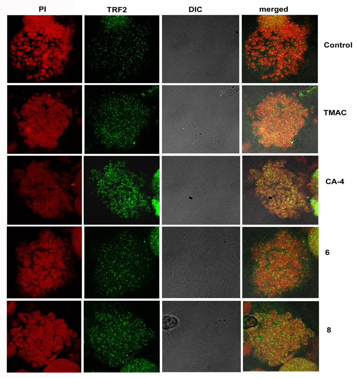 MCF-7 cells were grown in 60 mm dish till 70% confluency. Nocodazole (40 ng/ml) was added 12 h before the compound treatments (TMAC, CA-4, 6 and 8) at 30 μM final concentration. Treatment with compounds was carried for 24 h time period. 4-5 h prior to harvest 100 μg/ml colchicine was added. Immediately after treatment cells were washed with PBS and trypsinised. Then cell pellet was dissolved 0.56% KCl and incubated for 20 min followed by centrifugation at 1000 rpm for 3 min. Supernatant was discarded. The pellet is flicked and nuclei solution was added in to funnel and cytospin was carried out at 1000 rpm for 5-6 min. Slides were removed and fixed in 4% paraformaldehyde. Slides were washed with PBS for 15 min and incubated in triton X-100 and sodium azide solution for 45 min. This is followed by addition of 30 μl of TRF2 antibody and incubated overnight at 4°C. The slide is incubated in blocking solution (goat serum) for 30 min at 4°C. Secondary antibody was added and incubated for 3 h in dark at room temperature. Slides were washed for 15 min and incubated with RNaseA (0.5 μg/ml) and mounted in PI (Vecta shield).