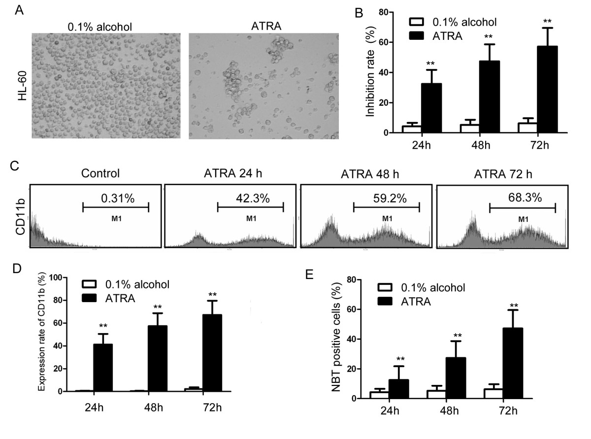 (A) Morphology of HL-60 cells treated with 0.1 μmol/L ATRA or 0.1% alcohol at 48 hours. (B) Cell inhibition rates in ATRA and 0.1% alcohol treated HL-60 cells at 24-72 hours, determined using the MTT assay. Each group was assayed in triplicate. Cell inhibition rate was calculated as 100% × (control group A values -experimental group A values)/control group A values. (C-E) HL-60 cell differentiation was assessed using CD11b and the NBT reduction test. (C-D) CD11b flow cytometry analysis of cells treated with ATRA or 0.1% alcohol. The expression rate was determined as the number of CD11b positive cells in 1 × 104 cells. (E) NBT analysis of HL-60 cells treated with ATRA or 0.1% alcohol. Two hundred cells were observed and positive cells with blue formazan crystals were counted by microscopy, **p < 0.01.