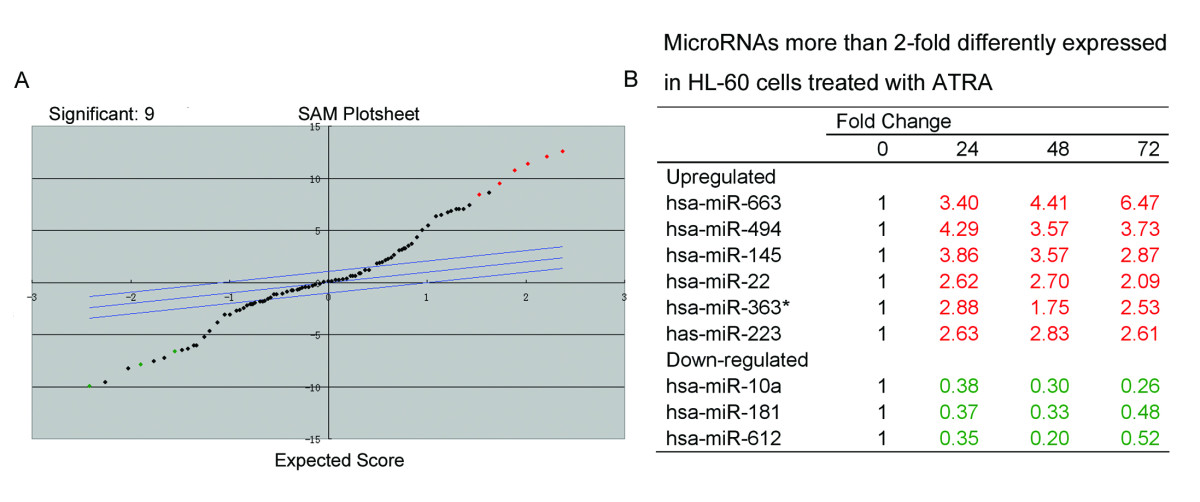 A miRNA microarray identified the expression of several microRNAs significantly changed in HL-60 cells during ATRA-induced differentiation. Significance analysis of microarrays (Figure 2A) was used to identify miRNAs whose expression was altered more than 2 fold in response to treatment with ATRA for 24-72 h, and the differentially expressed microRNAs are listed in Figure 2B.