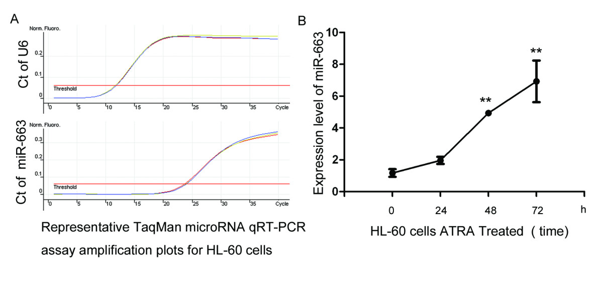 We confirmed miR-663 was significantly upregulated by ATRA treatment using TaqMan mircoRNA qRT-PCR assays. MiR-663 is a challenging molecule to amplify using PCR as the microRNA precursor consists of a highly stable hairpin due to GC base paring; however, novel technologies have been developed to successfully amplify and quantify the mature miR-663. Real-time PCR has become the gold standard of nucleic acid quantification due the high specificity and sensitivity and technological advancements have enabled quantification of microRNAs in a comparable manner to mRNAs. The time course of mature miR-663 expression determined by qRT-RCR (Figure 3A) indicated miR-663 was significantly upregulated in ATRA treated HL-60 cells. After 72 h, expression of miR-633 in the ATRA treated group was 6.93 ± 1.31 compared with the control group 1.17 ± 0.24,(Figure 3B), p < 0.01.
