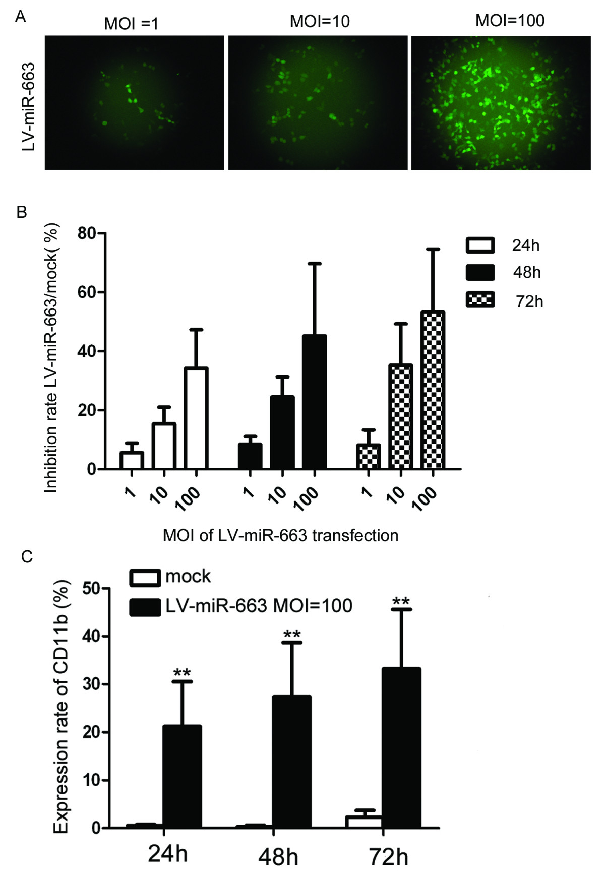 A lentivirus miR663 expressing (LV-miR-663) construct was generated. (A) Multiplicities of infection (MOI) of 1, 10 and 100 were used to determine optimal transduction efficiency in HL-60 cells using a control GFP-expressing lentivirus; GFP was detected in approximately 80% cells in the MOI 100 group. (B) MTT assays indicated the inhibition rates of HL-60 transfected with LV-miR-663 were 34.2 ± 13.1%, 45.2 ± 24.5% and 53.2 ± 21.3% at 1, 2 and 3 days, respectively, compared with mock transfected cells, p < 0.01. These results indicate miR-663 expression inhibits HL-60 proliferation in a time-dependent manner. (C) miR-663 induces HL-60 differentiation to mature granulocytes. In cells transfected with LV-miR-663 expression of the differentiation marker CD11b was increased significantly and after 1, 2 or 3 days the expression rates of CD11b were 21.2 ± 9.3%, 27.4 ± 12.5% and 33.2% ± 12.4% respectively in LV-miR-663 transfected cells, compared with the mock transfected cells (0.56 ± 0.21%, p < 0.01).