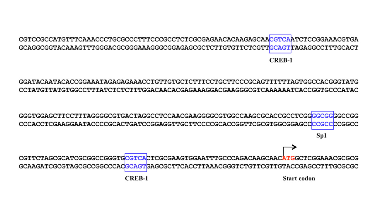 The consensus sequences of transcription factors CREB-1 and Sp1 were highlighted in the box. The start codon of the XPC gene is labeled in red.