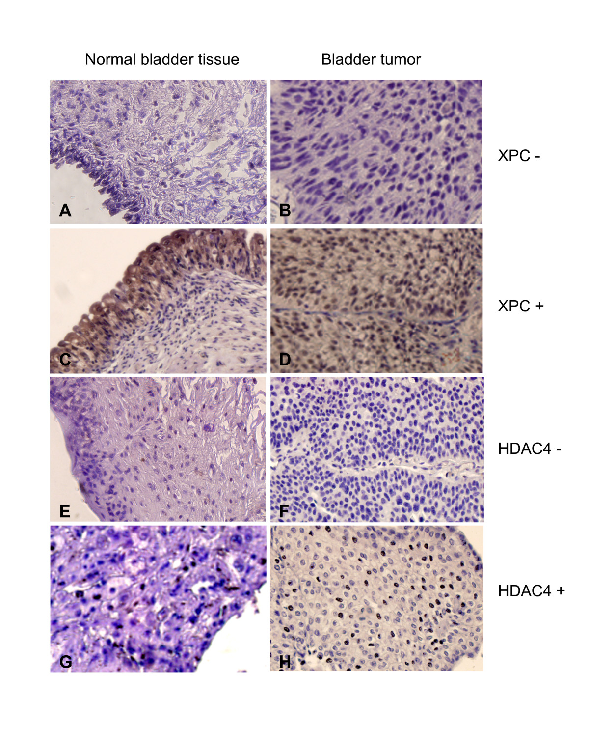 The bladder tumor tissue arrays purchased from US BioMax Inc. were stained with either XPC or HDAC4 antibodies in an immunohistochemistry (IHC) protocol. The presence of XPC or HDAC4 protein was determined by light microscopy and the image was recorded by a DP Controller software (Olympus Corp., Center Valley, PA).