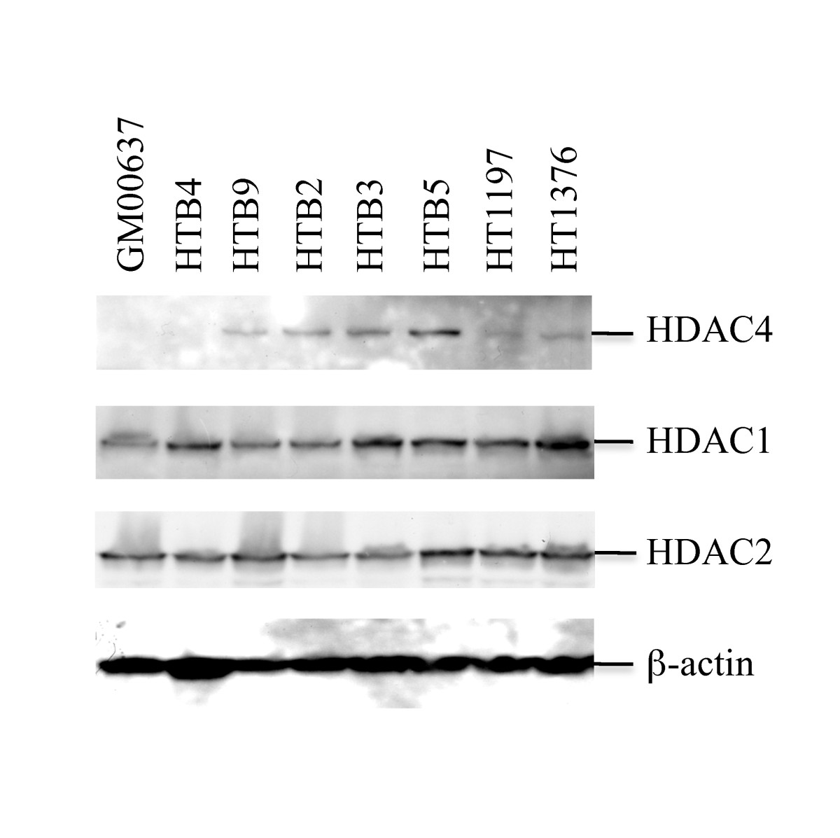 The results of our IHC studies revealed strong correlation between over-expression of the HDAC4 and the occurrence of bladder tumors. To validate the IHC result, we further determined expression of several HDACs, including HDAC4, HDAC1, and HDAC2, in the HTB4, HTB9, HTB2, HTB3, HTB5, HT1197 and HT1376 bladder cancer cells (Figure 4). The expression of these HDACs in the GM00637 normal human fibroblast cells was also determined in the western blotting study and used as a control. The results obtained from our western blots study indicated that the protein levels of the HDAC1 and HDAC2 were similar in all the tested cells (Figure 4 middle panels). In contrast, the expression levels of HDAC4 were greatly increased in most of the tested bladder cancer cells except the HTB4 bladder cancer cells in comparison to that of the GM00637 normal human fibroblast cells (Figure 4 top panel). This result confirmed our IHC results and suggested the important role of HDAC4 over-expression in the bladder cancer development.