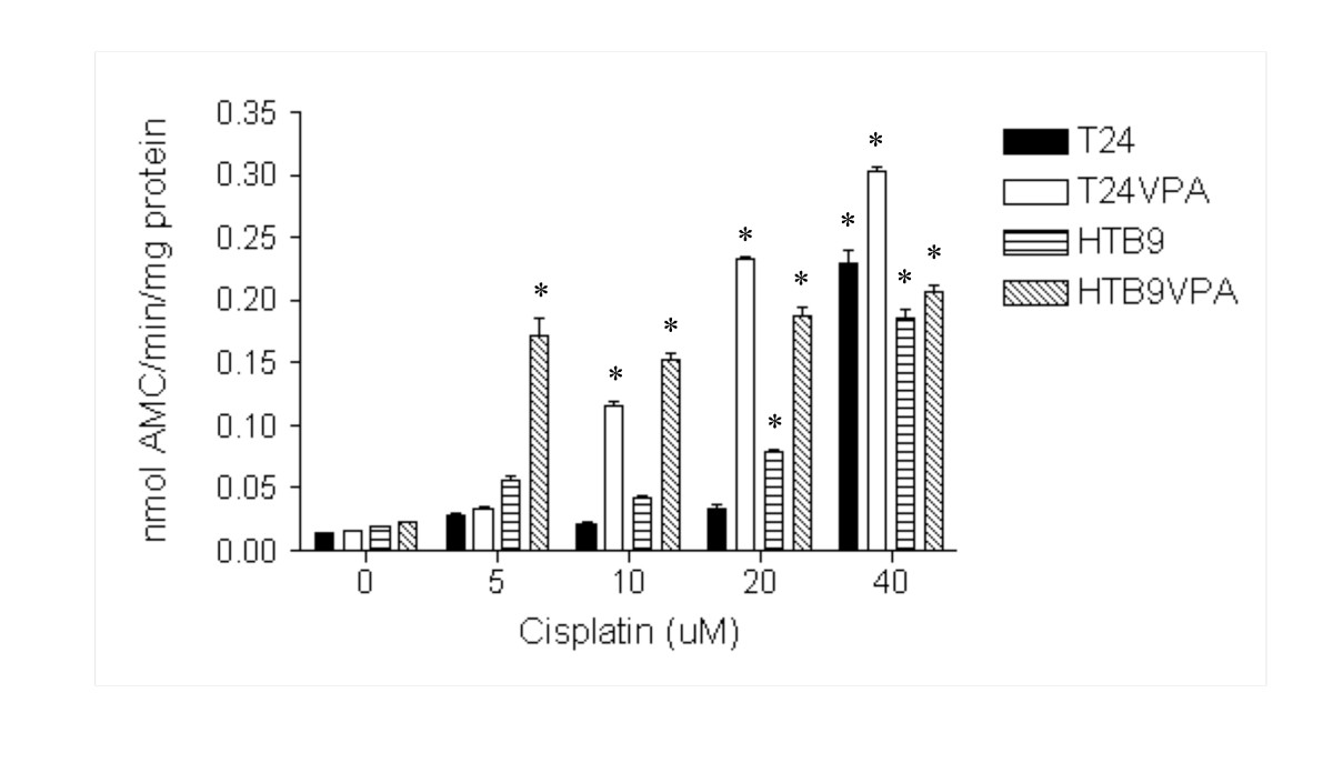 The VPA treatment (5 mM) was done 24 hours prior to the cisplatin treatment. The cells were treated with cisplatin at the indicated concentrations for 3 hours and then cultured in the cell culture incubator for 40 hours before the cells were harvested and the caspase 3 activity was measured. The caspase 3 activity was measured as nanomole of AMC/minute/mg of protein. (* statistical difference to that of the untreated cells with p value < 0.01).