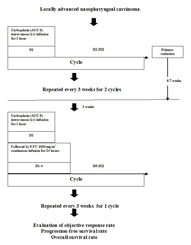 This study aimed to evaluate acute major toxicities, the response rate, 3-year overall survival and progression-free survival rate of locally advanced nasopharyngeal carcinoma patients on concurrent carboplatin chemoradiotherapy followed by carboplatin and 5-fluorouracil.