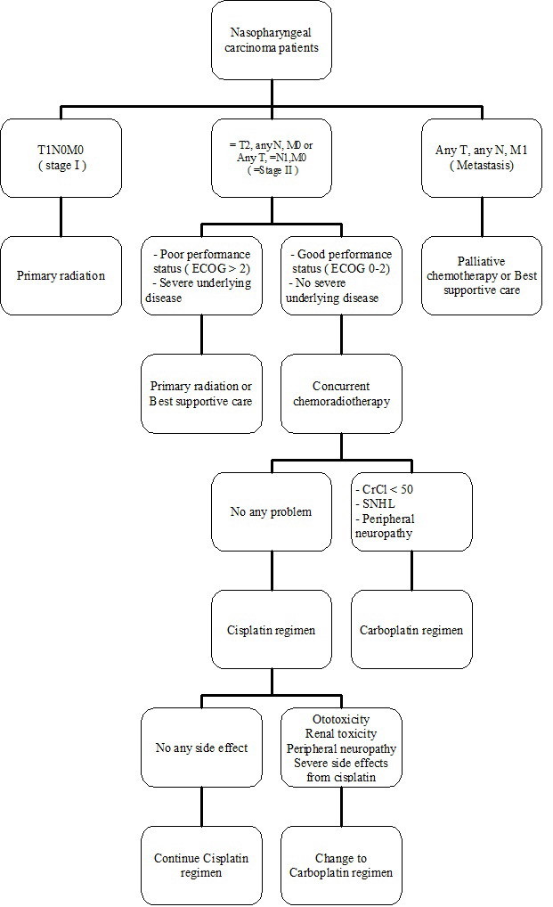 Nasopharyngeal carcinoma is a common head and neck cancer in Southeast Asia and more than 70% of patients presented with locally advanced stage cancer. According to the complexity of nasopharyngeal cancer treatment as well as the potential adverse events, a multidisciplinary approach is essentially encouraged. This requires the involvement of a head and neck oncologist, radiation oncologist and medical oncologist to achieve the best treatment outcome for individual patients. In our practice, the decision pathway is as shown in Figure 6.