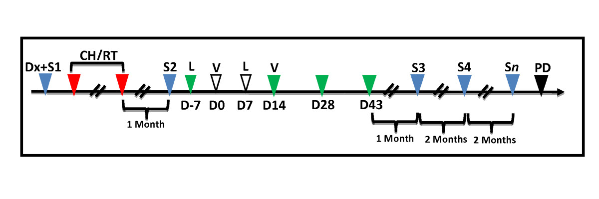 Leukapheresis' day is marked with "L" (D-7 and D7). Immunizations' day is marked with "V" (D0 and D14). Blue triangle - Evaluation step: "Dx+S1" = Diagnosis and 1st Radiologic Staging; "S2" = 2nd Radiologic Staging (1 month after conventional treatment); "S3" = 3rd Radiologic Staging (1 month after vaccine); "S4...Sn" = Radiologic staging was repeated every 2 months until the progression of the disease ("PD" - black triangle). Red triangle - Conventional treatment (chemo/radiotherapy). Green triangle - Lymphoproliferation test; it was done before immunization on D0 and D14.
