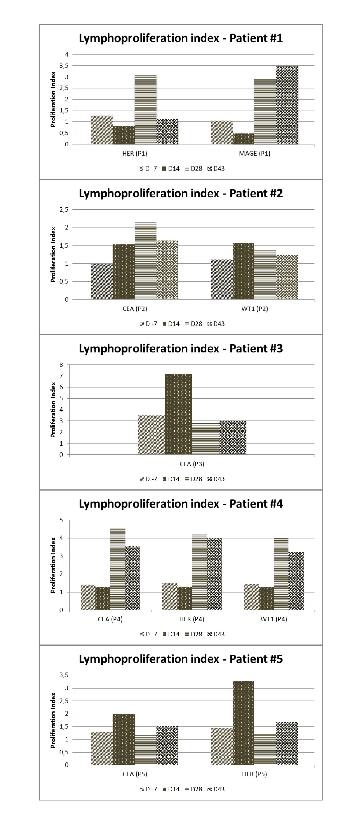 Lymphoproliferation index: "D -7" (1 week before 1st dose); "D 14" (2 weeks after 1st dose); "D 28" (2 weeks after 2nd dose); "D 43" (4 weeks after 2nd dose); HER, human epidermal growth factor receptor; MAGE, melanoma antigen; CEA, carcinoembryonic antigen; WT1, Wilms tumor protein; P1, patient 1; P2, patient 2; P3, patient 3; P4, patient 4; P5, patient 5.