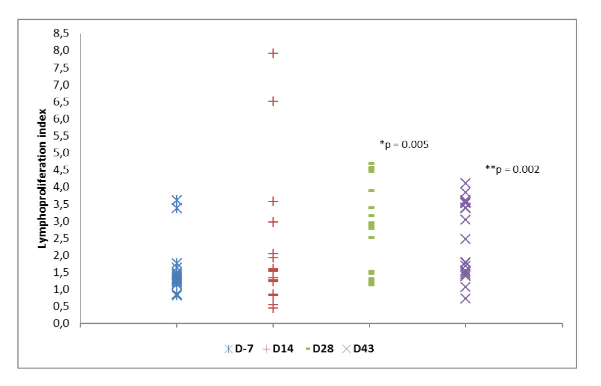 Lymphoproliferation's results from all patients and all antigens were compared using Wilcoxon signed ranks test. "D -7" (Median = 1.33; Min = 0.81; Max = 3.59); "D 14" (Median = 1.42; Min = 0.44; Max = 7.90); "D 28" (Median = 2.86; Min = 1.13; Max = 4.68); "D 43" (Median 2.13; Min = 0.72; Max = 4.10). The difference was significant between "D -7" and "D 28" (*p = 0.005) and "D-7" and "D-43" (**p = 0.002).