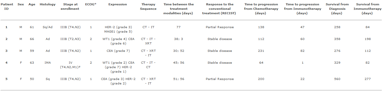 The clinical follow-up was available for all individuals for a minimum of 8.5 months from the diagnosis and almost 3 months from de second dose of immunotherapy. Data are presented in Table 1. Two individuals had partial response to the conventional therapy, while three had a stable disease. All of them received chemotherapy and those three were submitted to radiotherapy as well. Patient #2 underwent immunotherapy previous to the radiotherapy. From the last dose of the vaccine, the time to the disease progression and survival ranged between 1 to 82 and 82 to 277 days, respectively. One day after immunotherapy, the Patient # 4 presented worsening of the cough accompanied by progressive dyspnea. The follow up showed progressive disease on the radiologic exams.