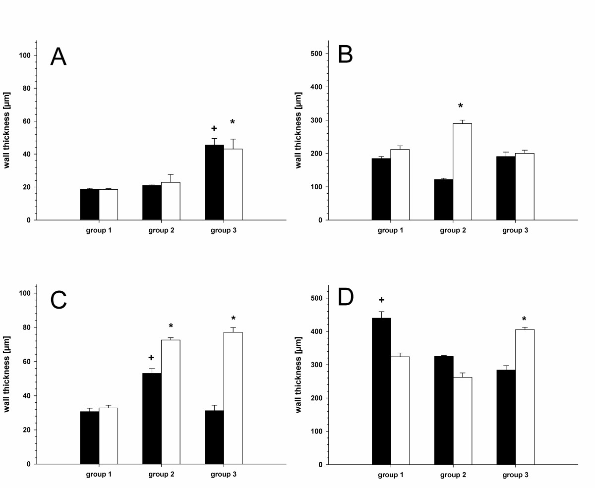Intima of the veins (A, *; + p < 0.05 vs. group1 and group 2), media of the veins (B, * p < 0.05 vs. group 3), intima of the arteries (C, <* p < 0.05 vs. group1, + p < 0.05 vs. group1 and group3) and media of the arteries (D, + p < 0.05 vs. group3, * p < 0.05 vs. group2). (black bars = transplant vessels; white bars = recipient vessels. Means and ± SEM).