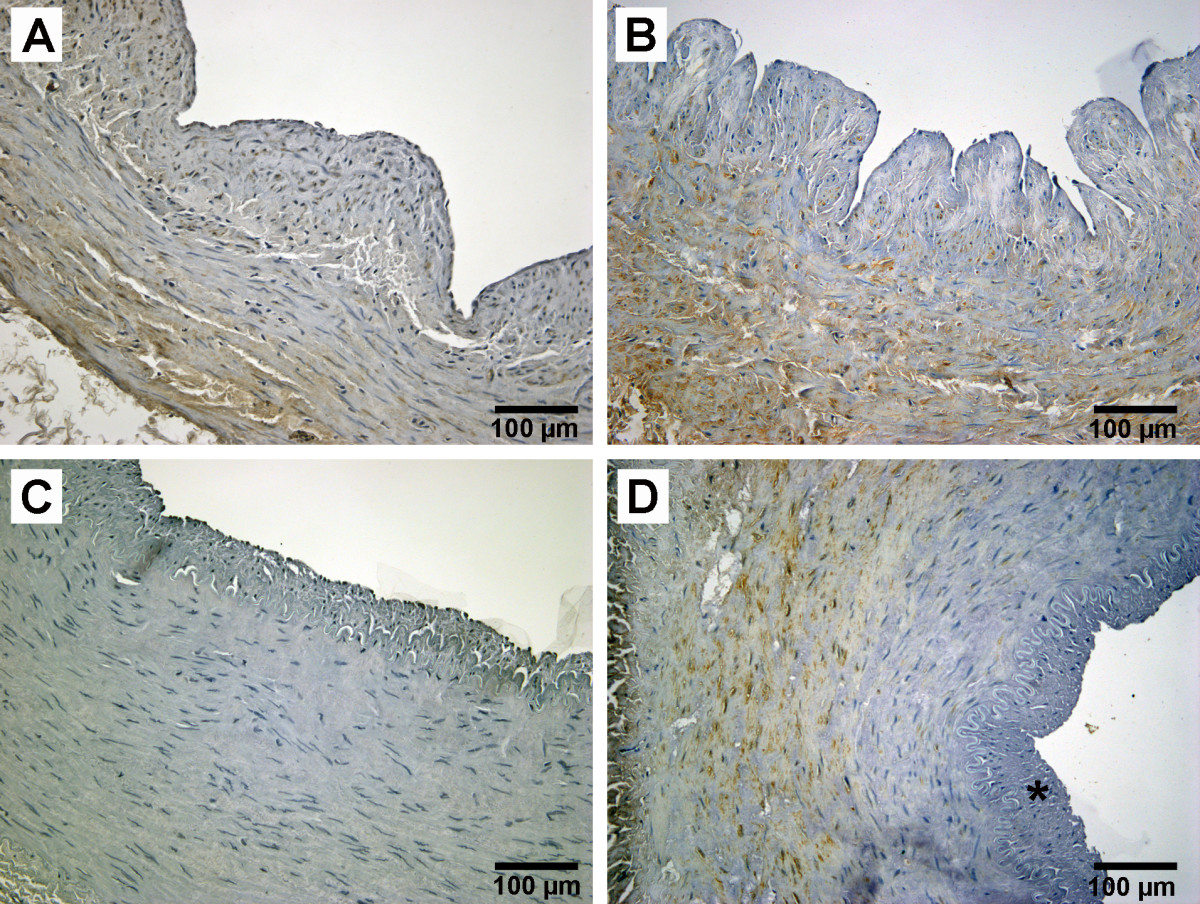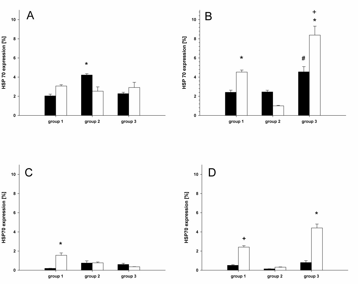 The results of HSP70 expression are presented in Figure 2A-D and table 2. A increased expression of HSP70 could be detected in the media layer of the recipient veins as well as in the transplant veins of patients treated with neoadjuvant chemoradiation (group3) (Figure 2B, Figure 3A+B). Radiation (group2) and chemoradiation decreased the HSP70 expression of the intima layer in recipient arteries (Figure 2C). Regarding the arteries, an enhancement of HSP70 expression was limited to the media layer of the recipient vessels (group3, Figure 3D). Conventional radiation (group2) led to a decrease of HSP70 expression in the media layer of recipient arteries (Figure 2D, Figure 3C).