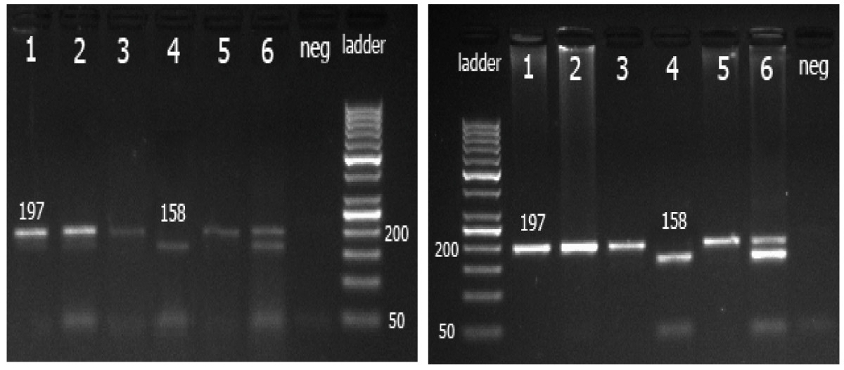 The polymorphism C3435T was analyzed using polymerase chain reaction and restriction fragment length polymorphism (PCR-RFLP) method. Desired DNA target sequence (197) was amplified as described by Cascorbi et al. (12) using a forward primer (5'-TGT TTT CAG CTG CTT GAT GG -3') and a reverse primer (5'-AAG GCA TGT ATG TTG GCC TC-3'). The reaction mixture of 25 μL contained 50 ng of genomic DNA, 0.5 μL of each primer, 12.5 μL of the green master mix, and 1.5-9.5 μL of deionized water. The reaction mixture was initially denatured at 94°C for 2 minutes, followed by 35 cycles of denaturation at 94°C for 30 s, annealing at 60°C for 30 s and extension at 72°C for 30 s. The termination elongation was performed at 72°C for 7 minutes. Successful amplification was confirmed by detection of a 197 bp band on a 2% agarose gel using a 100 bp DNA ladder. 10 μL of each PCR product was digested with 5 units of Sau3AI at 37°C overnight. The digested products were separated using 2.5% agarose gel and detected by ethidium bromide staining. Fragments obtained were 158 bp and 39 bp to the wild type genotype C/C, 197 bp to the mutant genotype T/T and 197 bp, 158 bp and 39 bp to the C/T genotype.