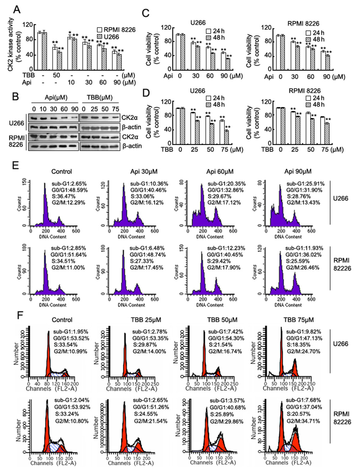 Initially, we investigated the effects of apigenin on CK2 kinase activity and expression level and compared these effects with that of TBB, which is a known selective CK2 inhibitor (23). The results showed that in accordance with TBB, apigenin suppresses CK2 kinase activity (Figure 1A), and reduces CK2α protein levels (Figure 1B) in both U266 and RPMI 8226 cells in a dose-dependent manner. Apigenin and TBB-induced suppression of CK2 was correlated with a dose-dependent decline in MM cell viability (Figure 1C, D), the magnitude of cell proliferation inhibition was greater in U266 cells compared to RPMI 8226 cells. We subsequently evaluated the effect of apigenin and TBB on cell cycle distribution using flow cytometry. Compared to vehicle-only treated controls, the apigenin and TBB treatment resulted in an obvious arrest of cells in G2/M phase after 24 h. The increase in cell number in the G2/M cell population was accompanied by a concomitant decrease in the number in S phase and G0/G1 phases of the cell cycle. Treatment with apigenin led to a dose-dependent accumulation of sub-G1 cells in both U266 and RPMI 8226 cells, thereby indicating that apigenin induces MM cell death, even at relatively low doses (30 μM), whereas TBB only induced minor cell death at 75 μM (Figure 1E, F).