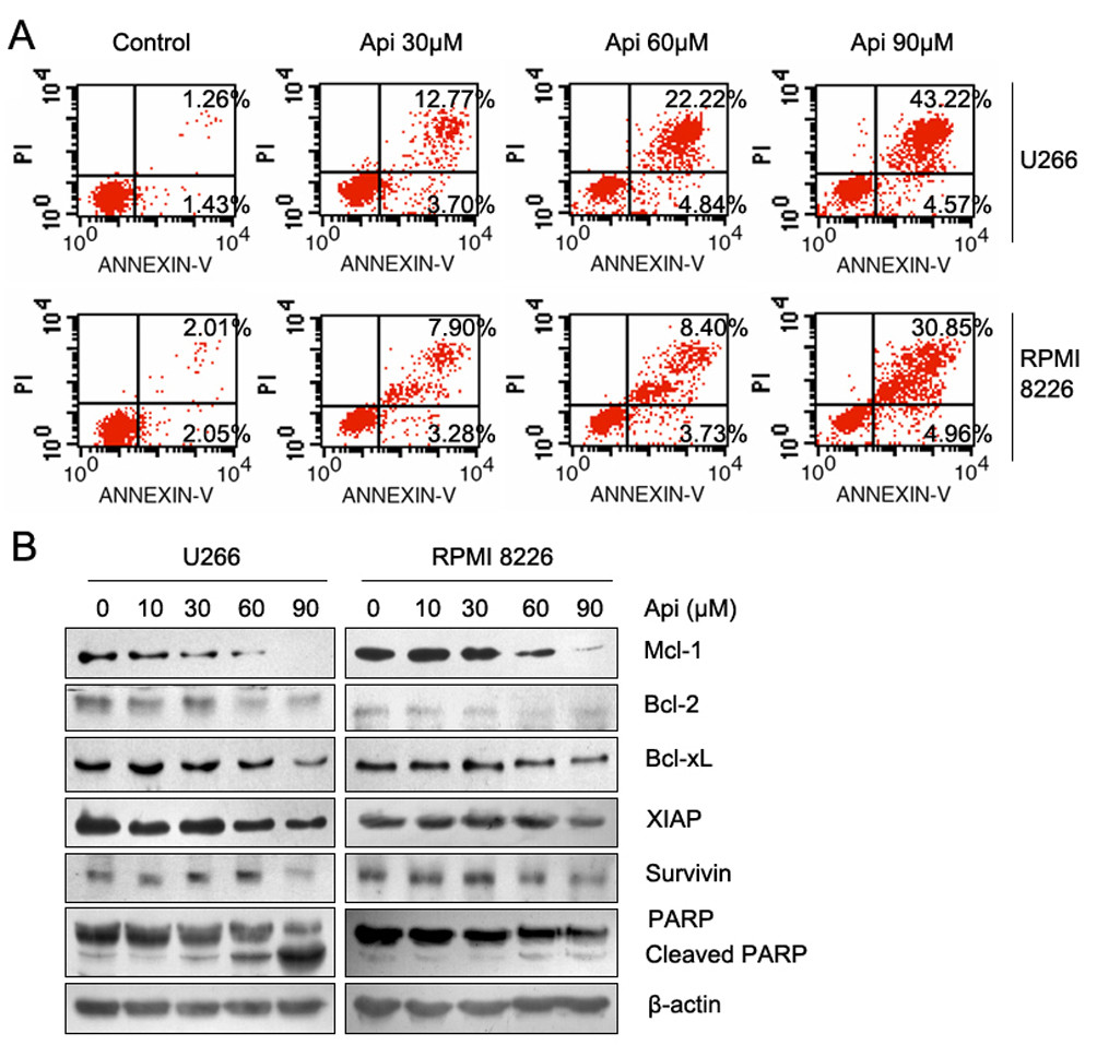 Next, we treated U266 and RPMI 8226 cells with apigenin for 24 h and analyzed apoptotic cell death using the Annexin V-FLUOS staining Kit. The results revealed a dose-dependent induction of early apoptotic or necrotic/late apoptotic cell death in these two cell lines (Figure 2A). Compared to RPMI 8226 cells, U266 cells showed more cell death, which was consistent with the results of the cell viability assay. Western blot analysis revealed that apigenin caused a dose-dependent decrease in the expression of multiple antiapoptotic proteins, including Mcl-1, Bcl-2, Bcl-xL, XIAP and Survivin. The PARP precursor exhibited a similar reduction, which was accompanied by an increase in the level of its cleaved fragments (Figure 2B). These data indicate that apigenin induced apoptosis in MM cells.