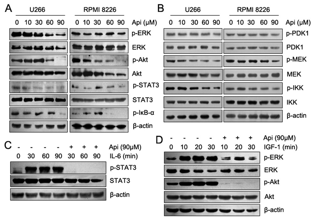 In (A) and (B), U266 and RPMI 8226 cells were treated with increasing doses of apigenin for 24 h, and the signaling proteins were detected by western blot analysis using the indicated antibodies. In (C) and (D), U266 cells were deprived of serum for 12 h and were treated with rhIL-6 (10 ng/ml) or rhIGF-1 (50 ng/ml) for the indicated times in the presence or absence of apigenin (90 μM). Whole-cell lysates were subjected to western blot analysis using the indicated antibodies.
