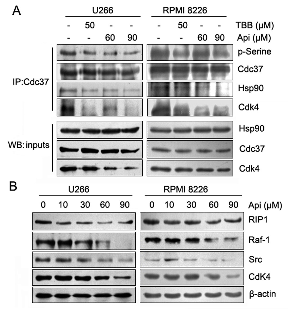 (A) U266 and RPMI 8226 cells were treated with apigenin or TBB for 24 h. Cdc37 protein was immunoprecipitated from whole cell lysates (500 μg each) with an anti-Cdc37 antibody and analyzed by immunoblotting with antibodies against phosphoserine, Hsp90, Cdc37, and Cdk4. For this experiment, 30 μg of the inputs was subjected to western blot to determine the levels of Cdc37, Hsp90, and Cdk4. (B) After treatment of apigenin for 24 h, the protein levels of Cd37 client kinases (RIP1, Raf-1, Src and Cdk4) in U266 and RPMI 8226 cells were detected by western blot analysis.