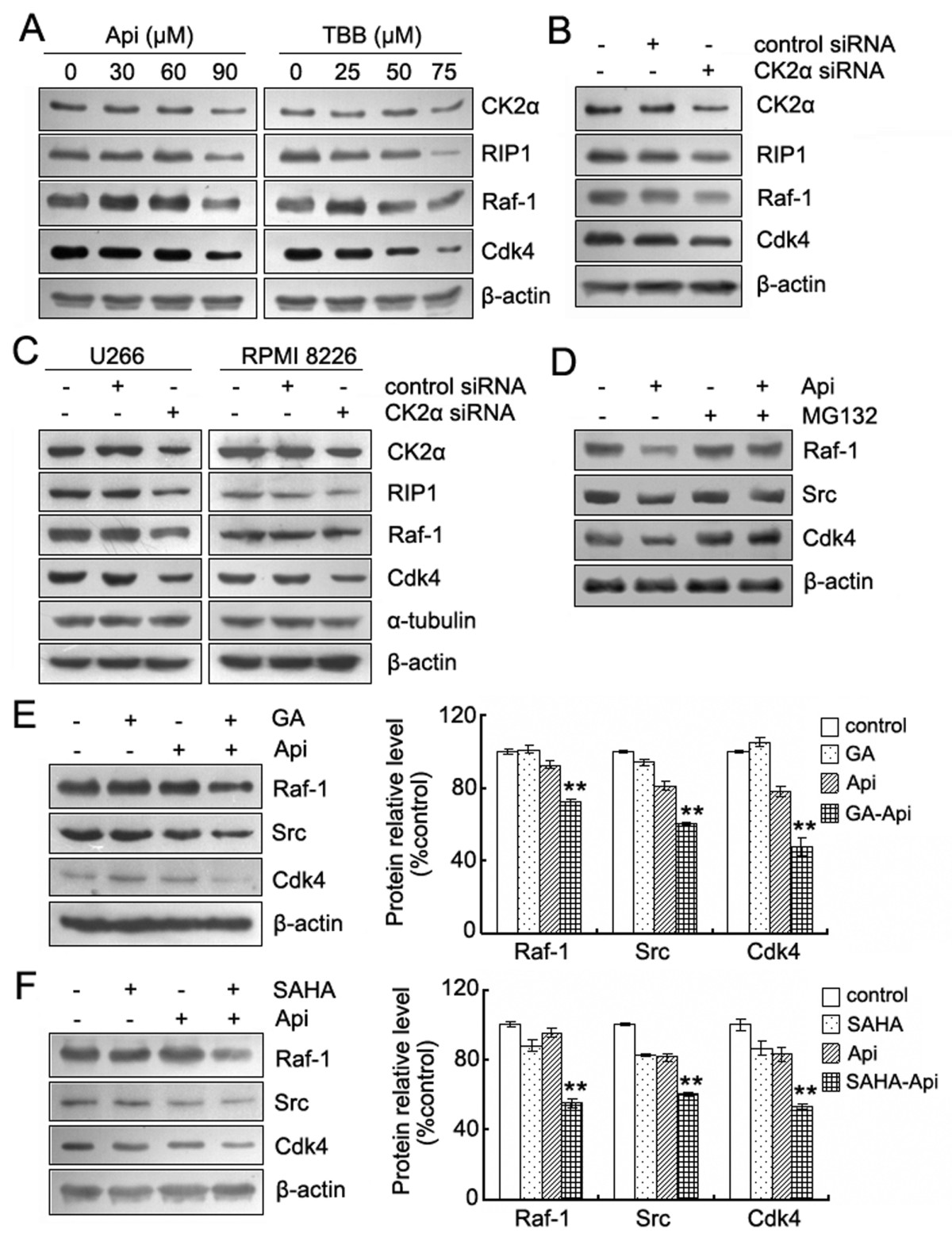 (A) HeLa cells were treated with the indicated concentrations of apigenin or TBB for 24 h. The protein levels of CK2α, RIP1, Raf-1 and Cdk4 were detected by western blot analysis. (B) HeLa cells were transiently transfected with control siRNA or CK2α siRNA for 48 h. Whole-cell lysates were analyzed by western blotting using the indicated antibodies. (C) Next, siRNA was introduced intoU266 and RPMI 8226 cells using electroporation. After 48 h, the cells were harvested to detect the protein levels by western blot. β-actin, as well as α-tubulin, served as loading control. (D) U266 cells were pretreated with MG132 (1 μM) for 1 h, and the cells were subsequently treated with apigenin (90 μM) for an additional 12 h. Whole-cell lysates were subjected to western blot analysis using antibodies against Raf-1, Src, Cdk4 and β-actin. (E) and (F) U266 cells were incubated with or without the Hsp90 inhibitor GA (0.2 μM) or SAHA (1 μM) for 24 h in the presence or absence of 30 μM apigenin. Whole-cell lysates were subjected to western blotting to determine the levels of Raf-1, Src, Cdk4 and β-actin. The bar graphs on the right show the percentage of intensities of the protein band from each treatment relative to the controls, which were defined as 100%. Values represent the means ± SD. *Significant difference from the three groups was designed by ANOVA, **p < 0.01.
