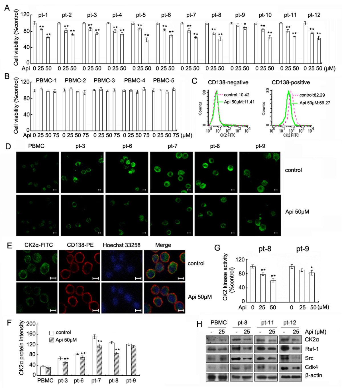 (A) Enriched CD138+ cells from 12 multiple myeloma patients were prepared by immunomagnetic bead selection. After treatment of apigenin for 24 h, cell viability was measured by the MTS assay as described in Material and Methods. Values represent the mean ± SD. *Significant difference from control. *p < 0.05, **p < 0.01. (B) PBMCs were treated with the indicated concentrations of apigenin for 24 h and the cell viability was measured by MTS assays. (C) After treatment with apigenin for 24 h, the expression of CK2α in CD138 negative and positive cells was analyzed by flow cytometry and quantified using the mean fluorescence intensity. (D) After treatment with or without 50 μM apigenin for 24 h, PBMCs and the enriched primary myeloma cells were examined by immunofluorescence microscopy to detect the levels of CK2α. The bar is equal to 5 μm. (E) The CD138+ cells were treated with apigenin for 24 h and were stained for CK2α (green), CD138 antigen (red) and DNA (blue). The bar, 5 μm. (F) The fluorescence intensity of each sample from (D) was analyzed using the softWoRx Explorer software. The average pixel intensities from 30 cells of three different fields in each group were measured, and background pixel intensities were subtracted. Values represent the mean ± SD of at least 3 measurements. * Significant difference from control cells, **p < 0.01. (G) After treatment of apigenin for 24 h, the CK2 kinase activity in primary MM cell purified from patient No. 8 and No. 9 was analyzed. *Significant difference from control cells, *p < 0.05, **p < 0.01. (H) Purified PBMC or enriched CD138+ cells from MM patients were treated with apigenin for 24 h, and the whole-cell lysates were subjected to western blotting to determine the levels of CK2α, Raf-1, Src, Cdk4 and β-actin.